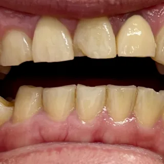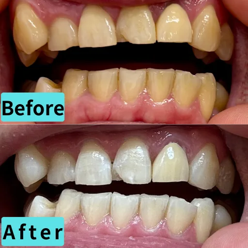 こちらのお客様はコーヒーやワインを飲む機会が多く、全体的に着色が目立つ状態です。これから理想の白さに向けて施術に入っていきます。