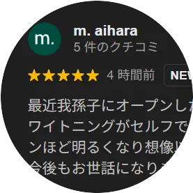 初めて利用しましたが丁寧な接客と、医療ジェルを使用したホワイトニングが低価格で利用出来るのがとても良いと思いお願いしました。 初回の施術からしっかり白くなったので満足です! 今後お世話になります。