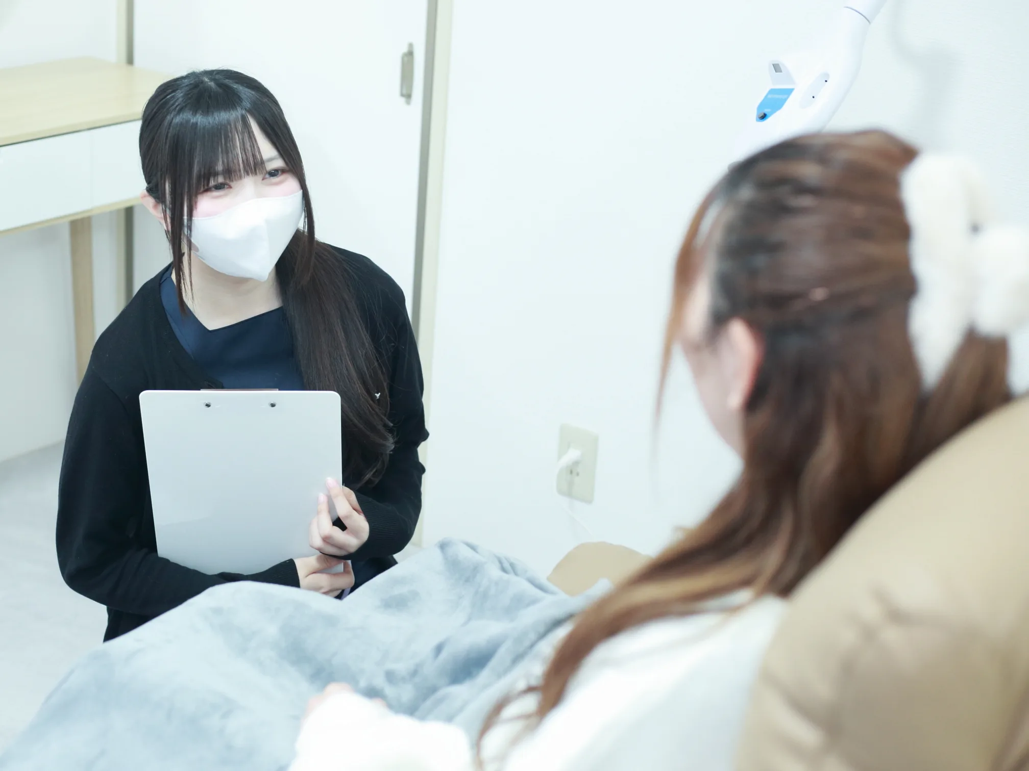 A.当店はセルフサロンですので、スタッフがお客様の歯に医療ジェルを塗ることはできません。ただし、一緒に付き添ってやり方をご案内しますので初めてでも心配いりません。ホワイトニングマシンの操作はスタッフが行いますので施術中はリクライニングソファーやマッサージチェアでゆっくりとお過ごしください。